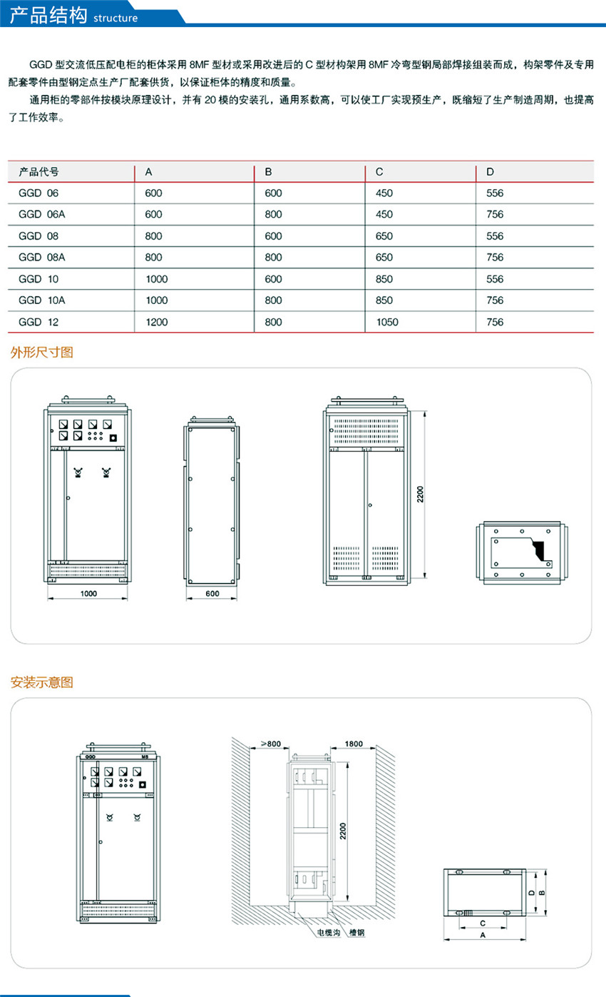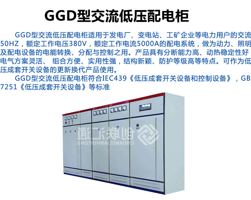 GGD型交流低壓配電柜是根據(jù)能源部主管上級(jí),廣大電力用戶及設(shè)計(jì)部門的要求,本著安全、經(jīng)濟(jì)、合理、可靠的原則設(shè)計(jì)的新型配電柜。產(chǎn)品具有分?jǐn)嗄芰Ω撸瑒?dòng)熱穩(wěn)定性好,電氣方案靈活、組合方便,系列性、實(shí)用性強(qiáng),結(jié)構(gòu)新穎、防護(hù)等級(jí)高等特點(diǎn),可以作低壓成套開(kāi)關(guān)設(shè)備的更新?lián)Q代產(chǎn)品使用。并且廣泛適用于發(fā)電廠、變電所、工業(yè)企業(yè)等電力用戶作為交流50HZ,額定工作電壓380V,額定電流至3150A 的配電系統(tǒng)中作為動(dòng)力,照明及配電設(shè)備的電能轉(zhuǎn)換、分配與控制之用。該產(chǎn)品分?jǐn)嗄芰Ω?,額定短結(jié)構(gòu)新穎等特點(diǎn)。該產(chǎn)品是我組裝式、固定面板開(kāi)關(guān)柜的代表產(chǎn)品之一。