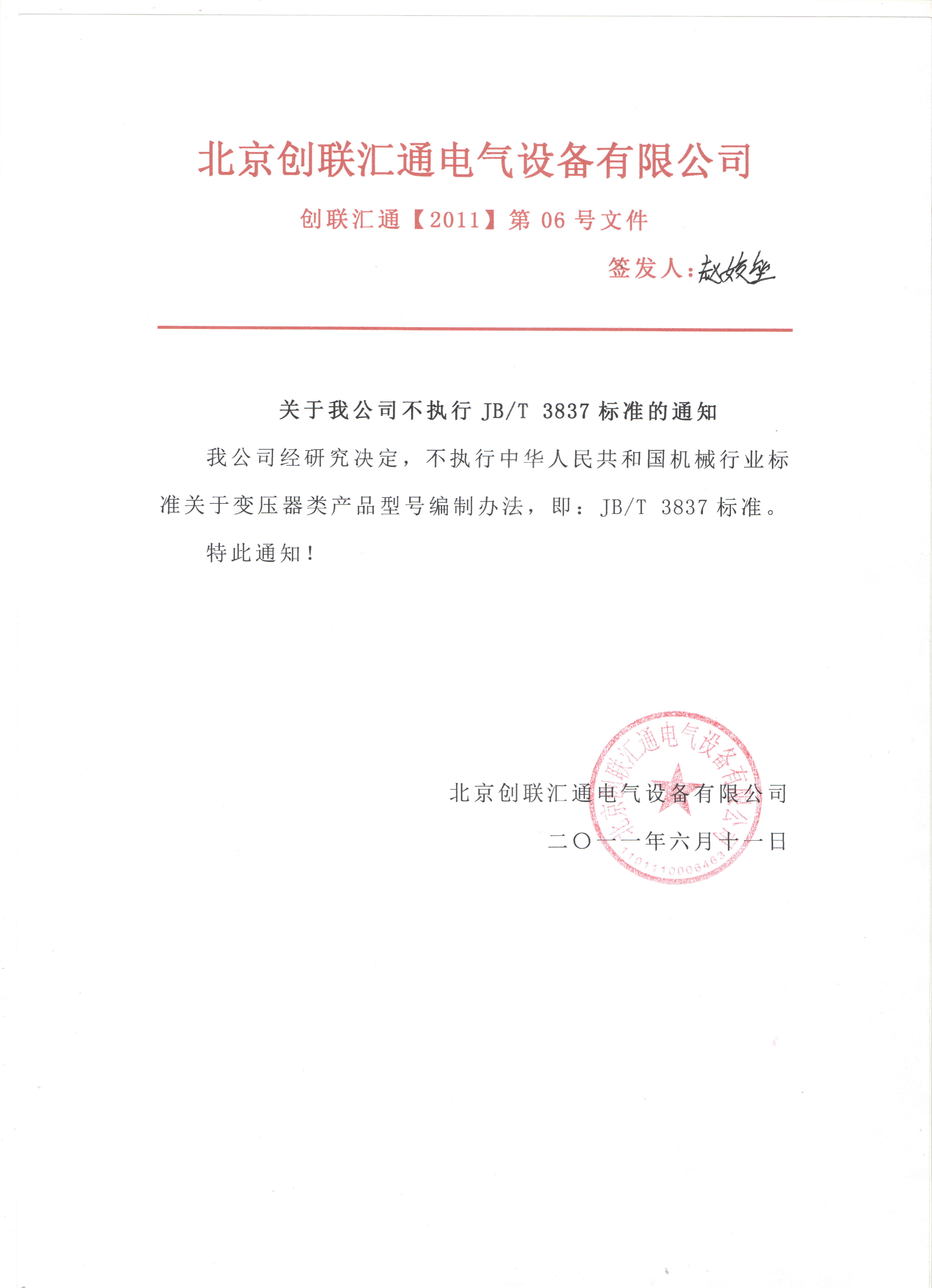 我公司不執(zhí)行JB/T 3837標準的通知