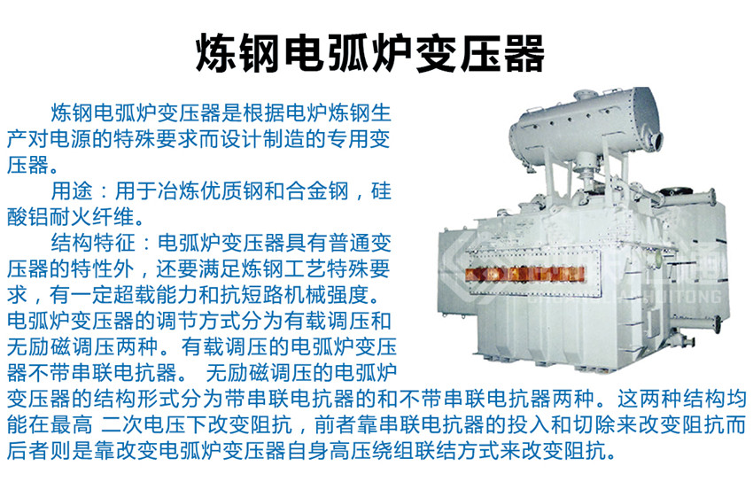 電弧爐變壓器具有普通變壓器的特性外,還要滿足煉鋼工藝特殊要求,有一定超載能力和抗短路機械強度。電弧爐變壓器的調節(jié)方式分為有載調壓和無勵磁調壓兩種。有載調壓的電弧爐變壓器不帶串聯電抗器。 無勵磁調壓的電弧爐變壓器的結構形式分為帶串聯電抗器的和不帶串聯電抗器兩種。這兩種結構均能在高 二次電壓下改變阻抗,前者靠串聯電抗器的投入和切除來改變阻抗,而后者則是靠改變電弧爐變壓器自身高 壓繞組聯結方式來改變阻抗。