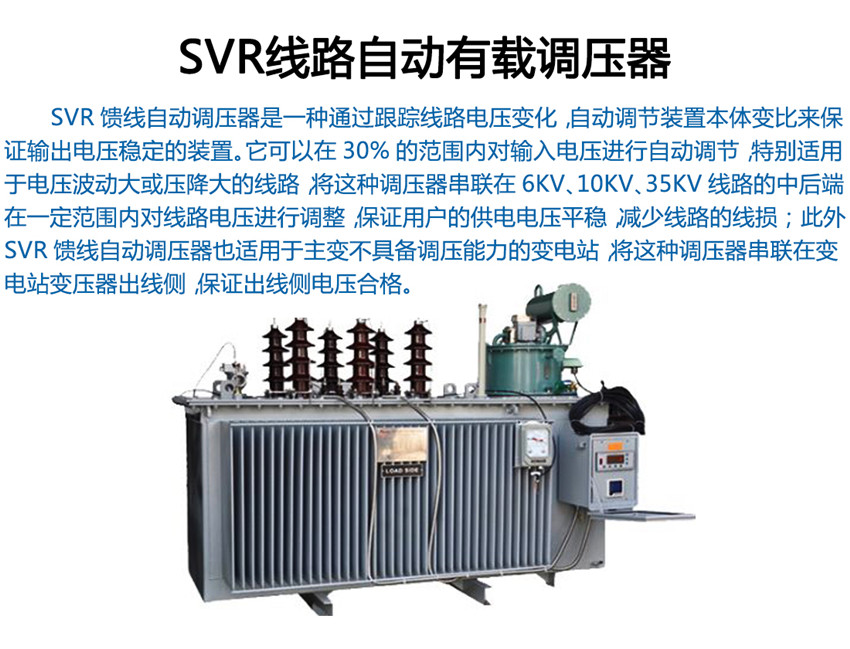 SVR線路自動(dòng)調(diào)壓器工作原理 SVR線路自動(dòng)調(diào)壓器共有三部分構(gòu)成:自耦變壓器、有載分接開關(guān)和自動(dòng)控制器。 自耦變壓器的整個(gè)線圈分為三部分:串勵(lì)線圈、并勵(lì)線圈,控制線圈。其中,串勵(lì)線圈是一個(gè)有多個(gè)抽頭的繞組,這些抽頭通過有載分接開關(guān)的不同接點(diǎn)串聯(lián)在輸入輸出之間,改變分接位置,從而改變自耦變壓器變比,達(dá)到調(diào)整電壓的目的;并勵(lì)線圈為自耦變壓器的公共繞組,產(chǎn)生傳遞能量的磁場(chǎng); 控制線圈為控制器提供工作電源和采樣信號(hào)。 有載分接開關(guān),是可在帶負(fù)載的情況下轉(zhuǎn)換接點(diǎn)的開關(guān)。在自動(dòng)調(diào)壓器中,串聯(lián)繞組的抽頭接在有載分接開關(guān)的不同接點(diǎn)上,可以通過轉(zhuǎn)換接點(diǎn)調(diào)節(jié)變壓器變比來改變其輸出電壓