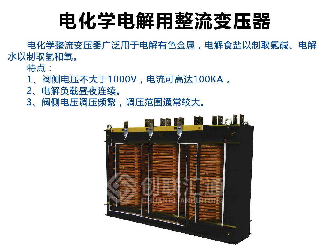 廣泛應(yīng)用于電化學(xué)工業(yè),這是應(yīng)用整流變最多的行業(yè),電解有色金屬化合物以制取鋁、鎂、銅及其它金屬;電解食鹽以制取氯堿;電解水以制取氫和氧等領(lǐng)域。