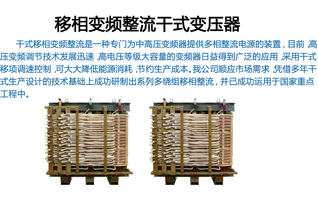 移相整流干式變壓器市場近年來呈現(xiàn)出良好的發(fā)展勢頭。由于其能實現(xiàn)大功率高壓電機的軟起動及改善網(wǎng)側(cè)的電流波形、消除電網(wǎng)諧波污染及提高負載下功率因數(shù)等諸多獨特效果,在降低能源消耗及用電量方面效果顯著,因此,在電力、冶金、礦山、市政、石油、化工和建材等行業(yè)已成功得到普及應(yīng)用。
